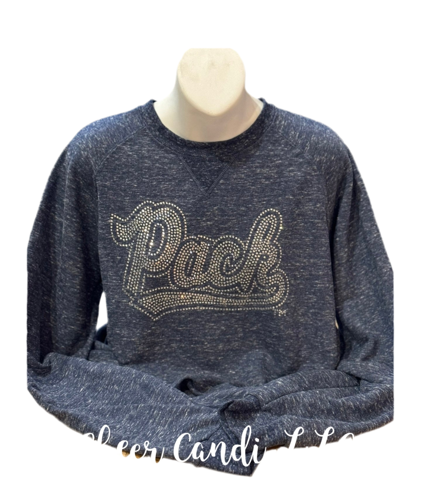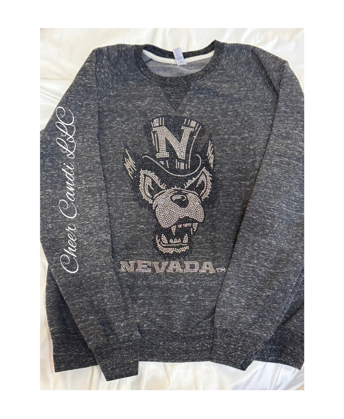 French Terry crewneck sweatshirt Jerzees 7.2 oz polyring spun cotton. Pack script logo, Top Hat Wolfie or Nevada logo clear rhinestone front only.